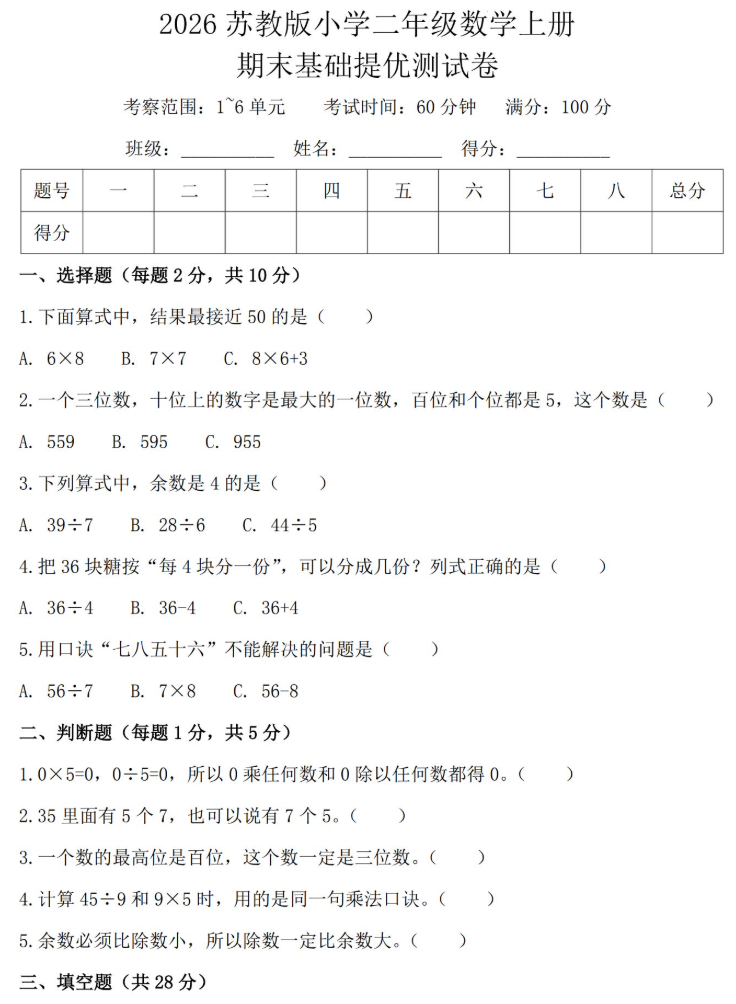 2026苏教版二年级数学上册期末基础提优测试卷免费下载(含答案)