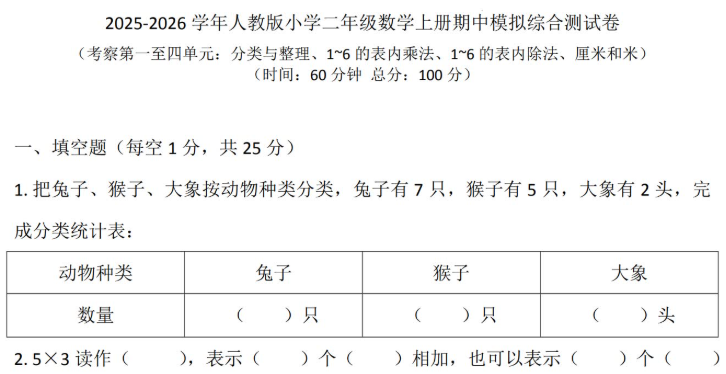 2025-2026人教版二年级数学上册期中模拟综合测试卷免费下载(附答案)