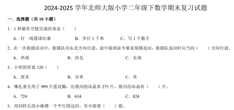2025北师大版二年级数学下册期末复习试题免费下载(附答案)