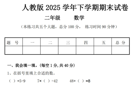 人教版2025二年级数学下学期期末试卷免费下载(附答案)