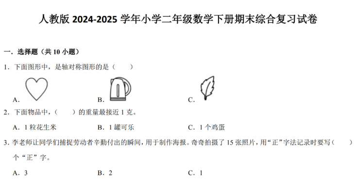 2025人教版二年级数学下册期末综合复习试卷免费下载(附答案)
