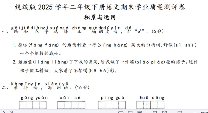 统编版2025二年级语文下册期末学业质量测评卷免费下载(附答案)