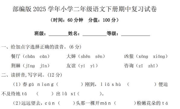 2025部编版二年级语文下册期中复习试卷免费下载(附答案)