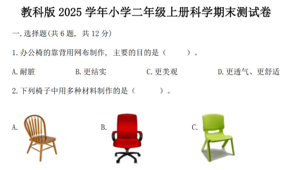 教科版2025二年级科学上册期末测试卷免费下载(附答案)