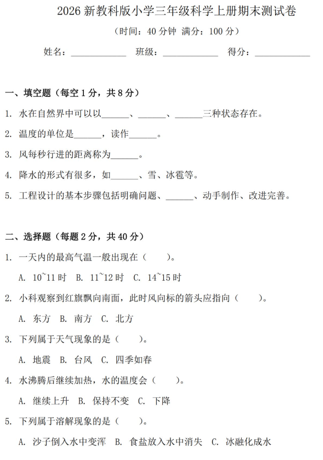 2026新教科版三年级科学上册期末测试卷免费下载(含答案)