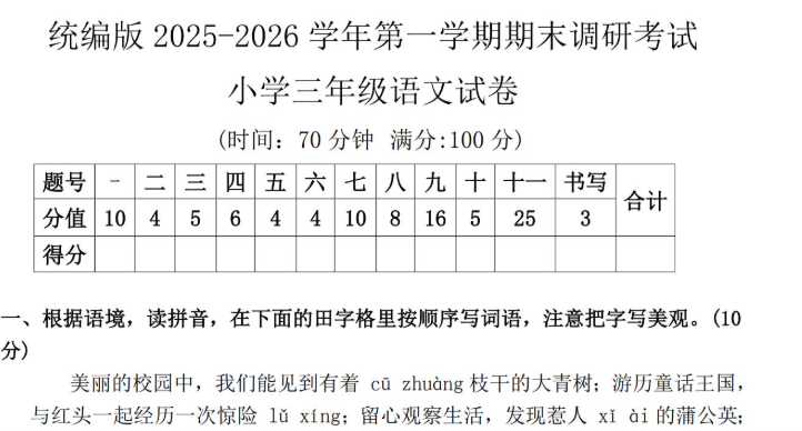 统编版2025-2026学年三年级语文第一学期期末调研考试卷免费下载(附答案)