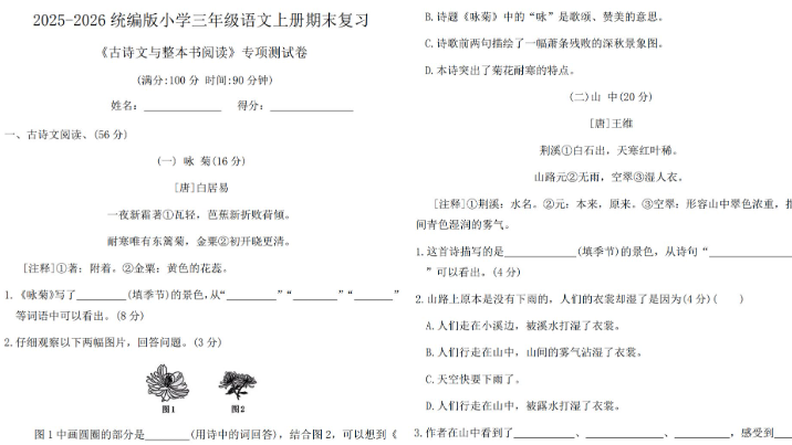 2025-2026三年级语文上册期末复习《古诗文与整本书阅读》专项测试卷免费下载(附答案)