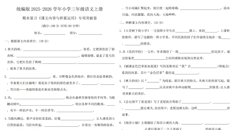 统编版2025-2026三年级语文上册期末复习《课文内容与积累运用》专项突破卷免费下载(附答案)