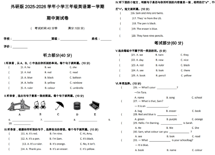 外研版2025-2026三年级英语第一学期期中测试卷免费下载(附答案、听力材料及音频)