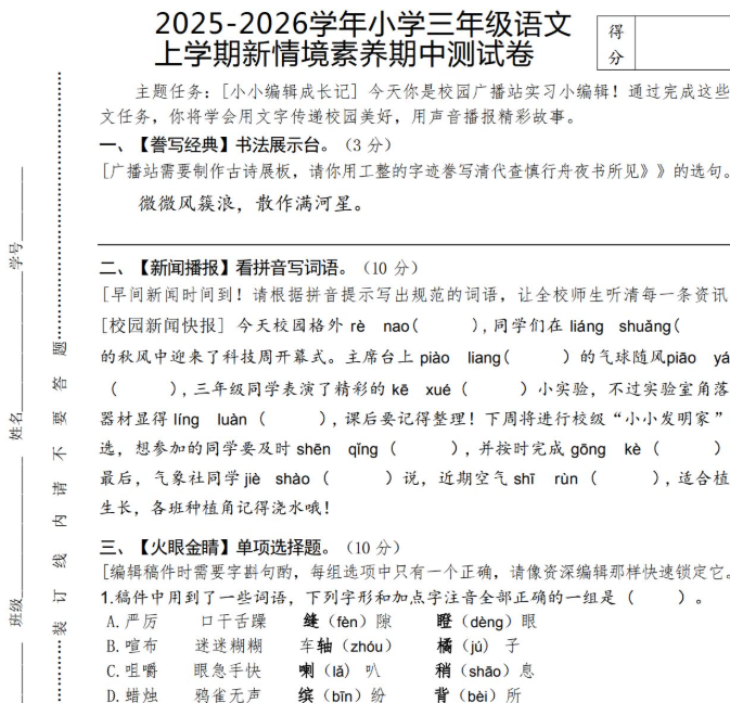 2025-2026三年级语文上学期新情境素养期中测试卷免费下载(附答案、答题卡)