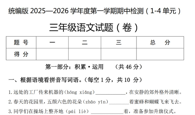统编版2025-2026三年级语文第一学期期中检测卷免费下载(附答案)