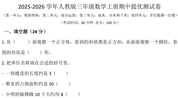 人教版2025-2026三年级数学上册期中提优测试卷免费下载(附答案)