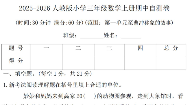 人教版2025-2026三年级数学上册期中自测卷免费下载(附答案)
