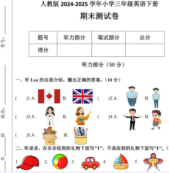 人教版2025三年级英语下册期末测试卷免费下载(附答案、听力材料、音频MP3)