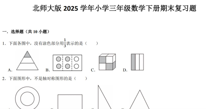 北师大版2025三年级数学下册期末复习卷免费下载(附答案)