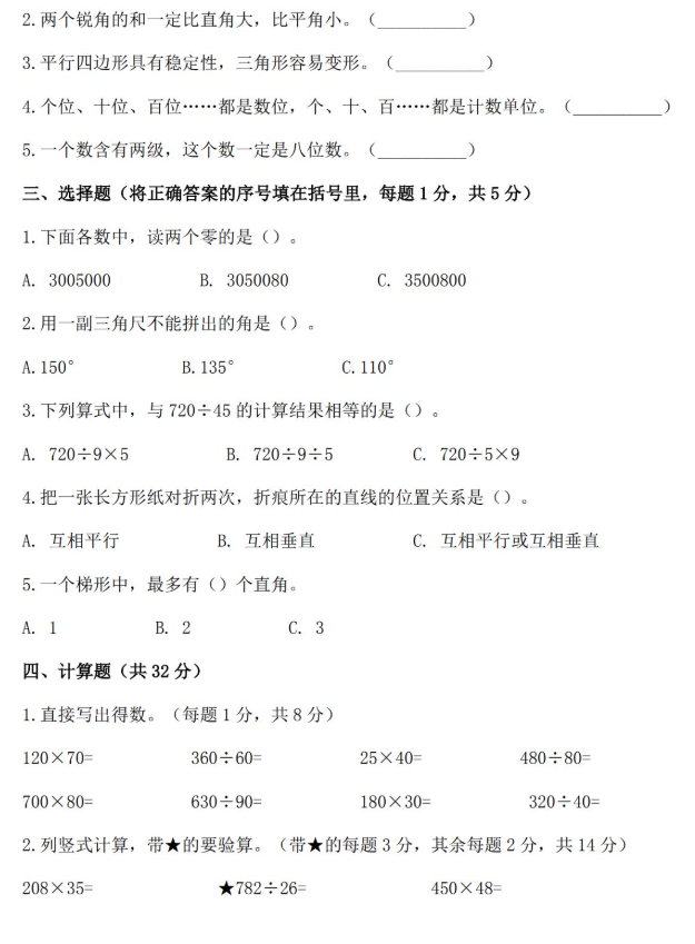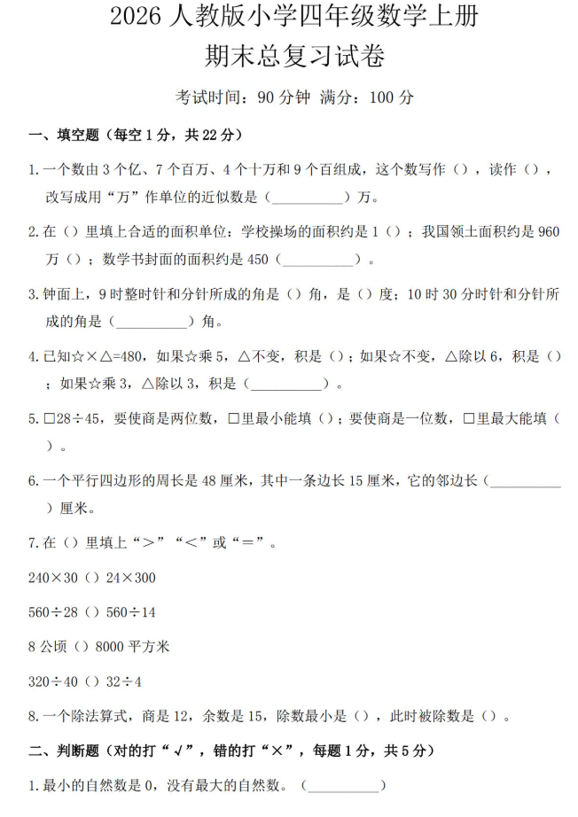 2026人教版四年级数学上册期末总复习试卷免费下载(附答案)