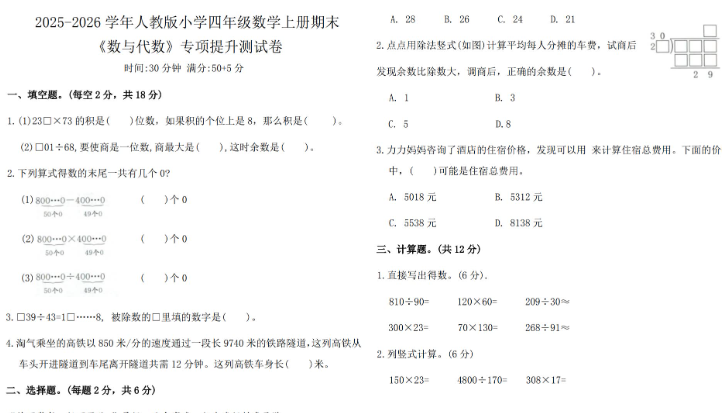 人教版2025-2026四年级数学上册期末《数与代数》专项提升测试卷免费下载(附答案)