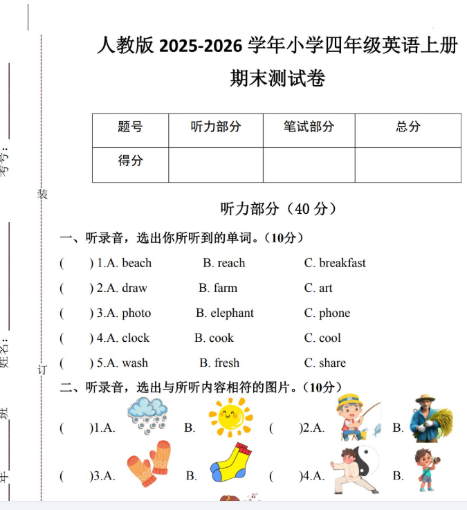 人教版2025-2026四年级英语上册期末测试卷免费下载(附答案及听力音频)