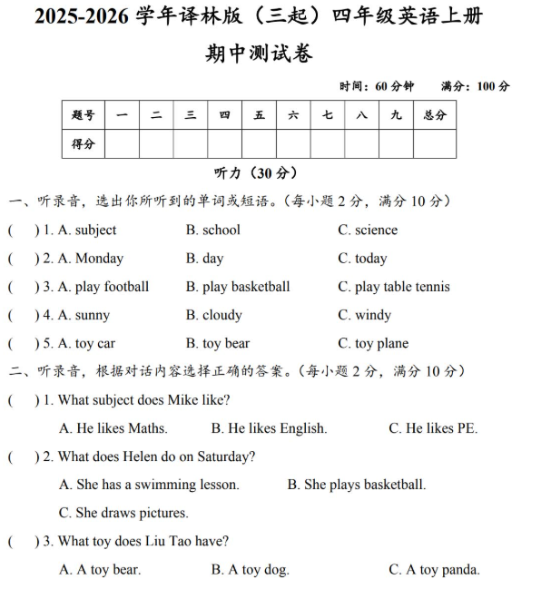 2025-2026学年译林版(三起)四年级英语上册期中测试卷免费下载(附答案、听力材料及音频)