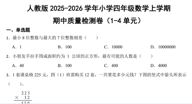 人教版2025-2026四年级数学上学期期中检测卷免费下载(附答案)
