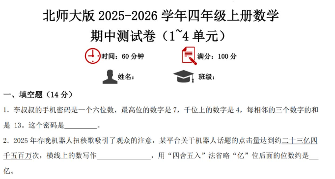北师大版2025-2026四年级数学上册期中测试卷免费下载(附答案)