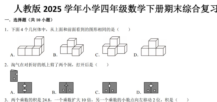 2025人教版四年级数学下册期末综合复习试卷免费下载(附答案)