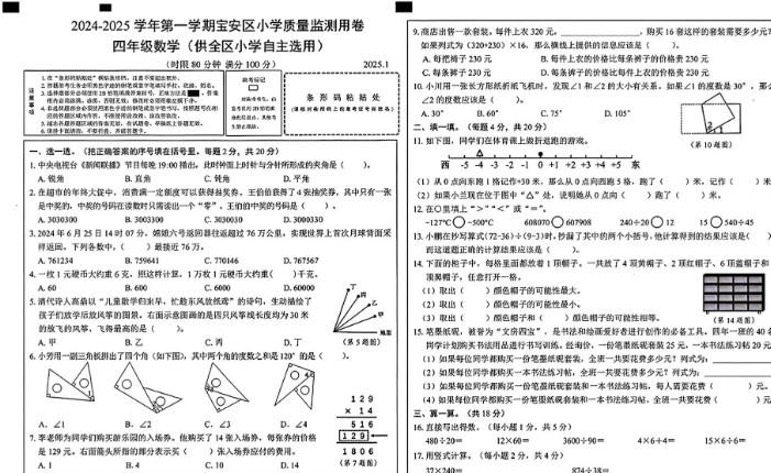 深圳宝安区2025年四年级数学上学期期末考试卷(供本区小学自主选用)