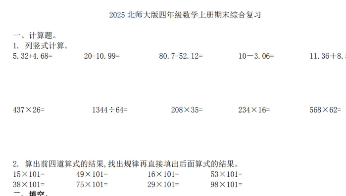 2025北师大版四年级数学上册期末综合复习卷免费下载(附答案)