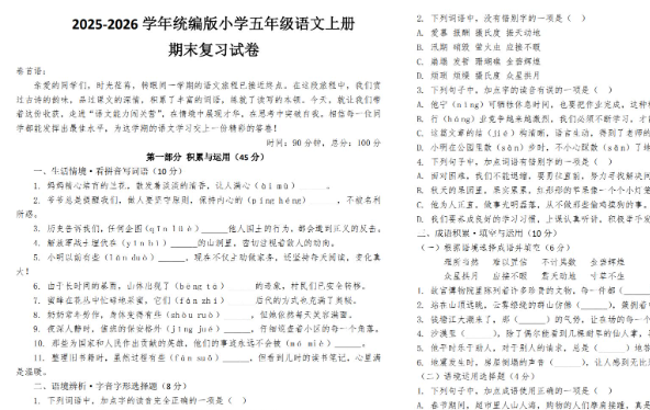 2025-2026统编版五年级语文上册期末复习试卷免费下载(附答案)