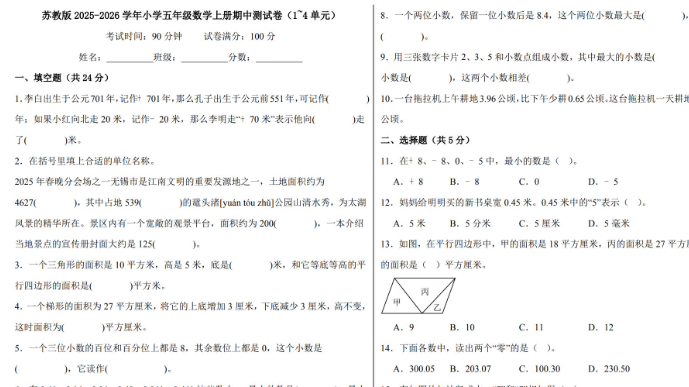 苏教版2025-2026五年级数学上册期中测试卷免费下载(附答案)