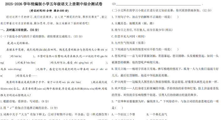 2025-2026统编版五年级语文上册期中综合测试卷免费下载(附答案)