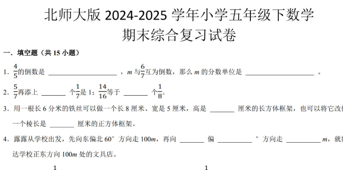 北师大版2025五年级数学下册期末综合复习试卷免费下载(附答案)