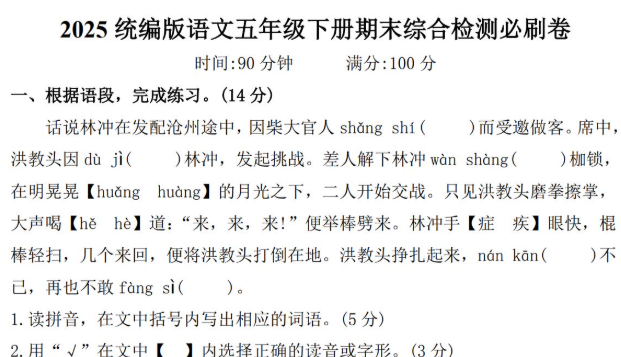 2025统编版五年级语文下册期末综合检测必刷卷免费下载(附答案)