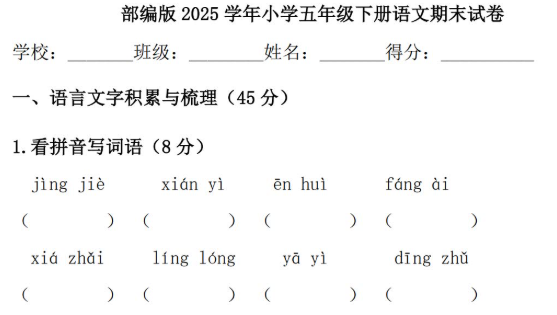 2025部编版五年级语文下册期末测试卷免费下载(附答案)