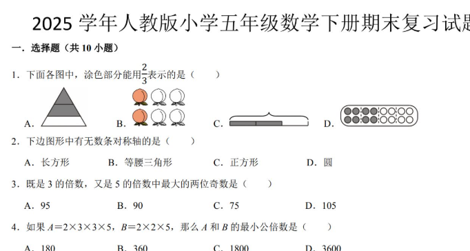 2025人教版五年级数学下册期末复习试卷免费下载(附答案)