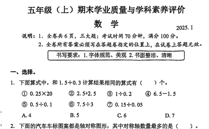 深圳罗湖区2025年五年级数学上学期期末考试卷(2025年1月)