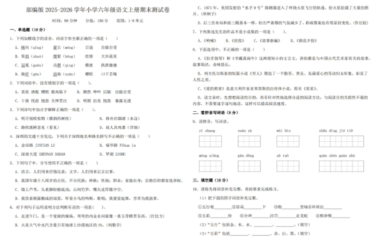 部编版2025-2026六年级语文上册期末测试卷免费下载(附详细答案解析)