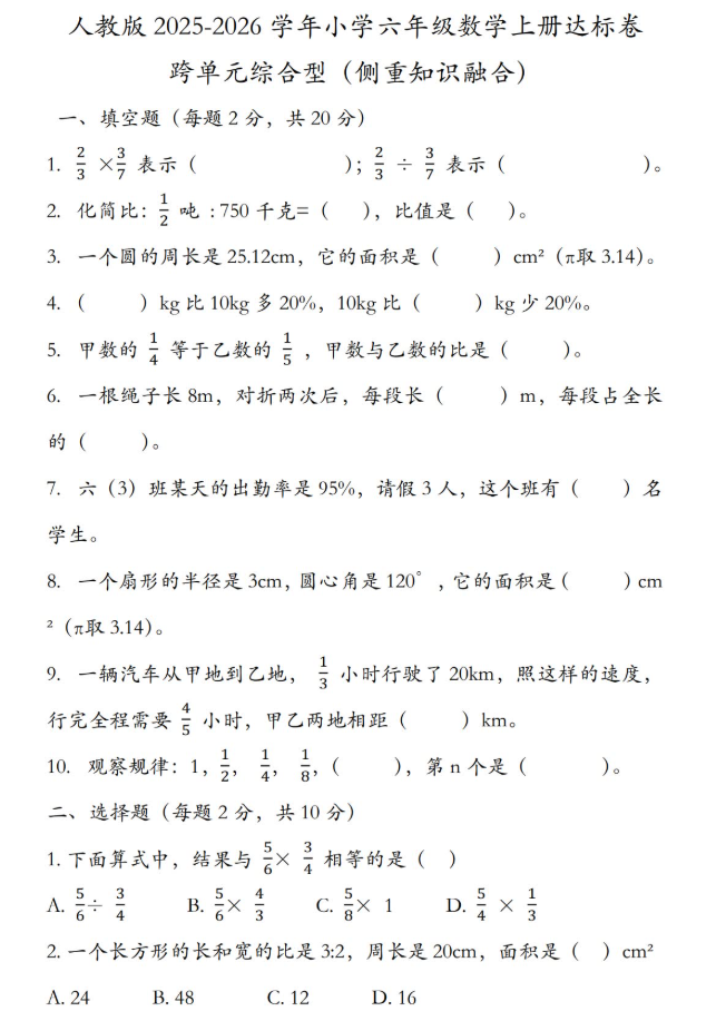 人教版2025-2026六年级数学上册《跨单元综合型(侧重知识融合)》达标卷免费下载(附答案)