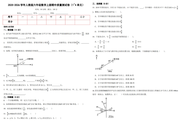 2025-2026人教版六年级数学上册期中质量测试卷免费下载(附答案)