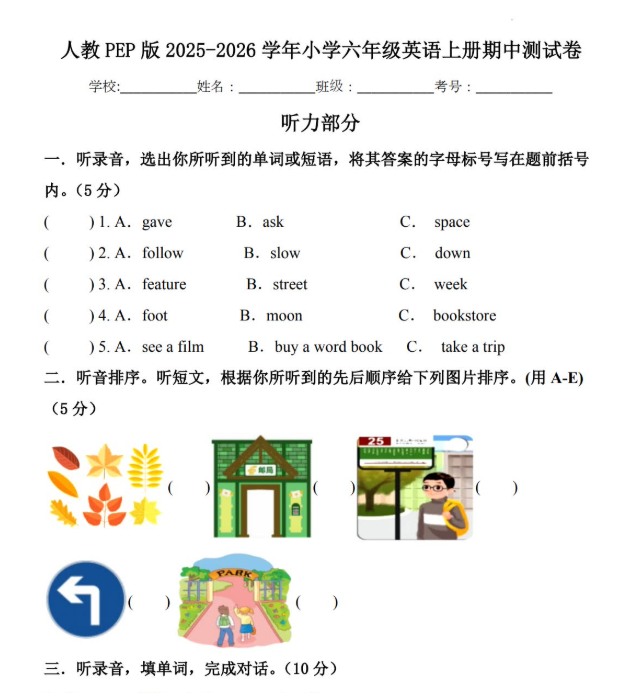 人教版2025-2026六年级英语上册期中测试卷免费下载(附答案及听力音频)
