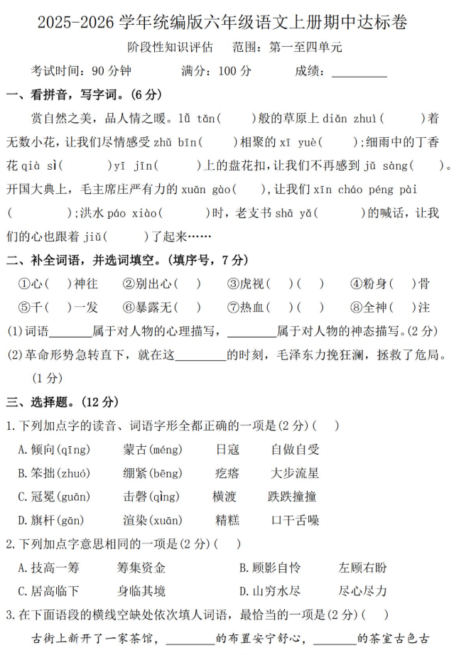 统编版2025-2026六年级语文上册期中达标测试卷免费下载(附答案)