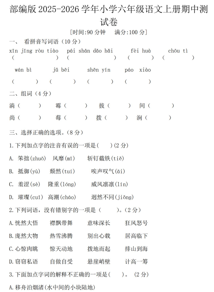 部编版2025-2026六年级语文上册期中测试卷免费下载(附答案)