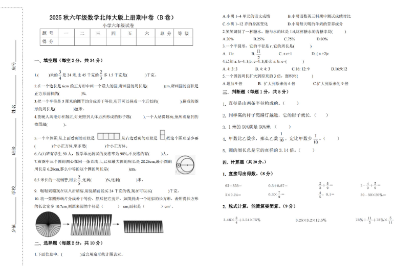 北师大版2025秋六年级数学上册期中测试B卷免费下载(附答案解析)