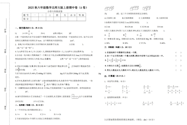 北师大版2025秋六年级数学上册期中测试卷A卷免费下载(附答案解析)