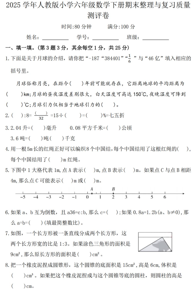 2025人教版六年级数学下册期末整理与复习试卷免费下载(附答案)