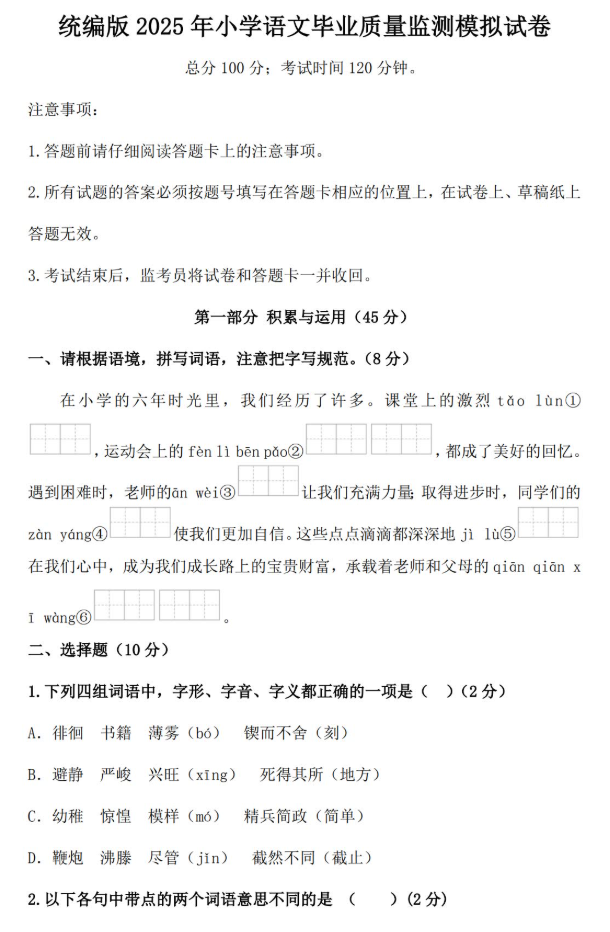 2025统编版小学语文毕业质量监测模拟试卷免费下载(附答案)