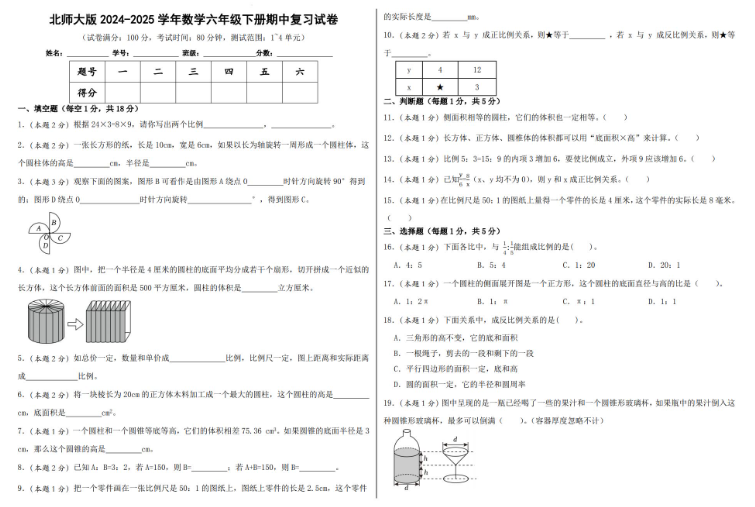 2025北师大版六年级数学下册期中复习试卷免费下载(附答案)