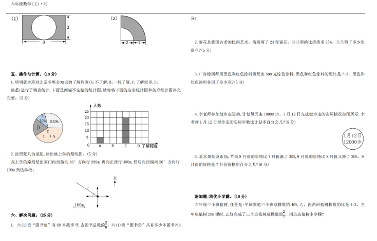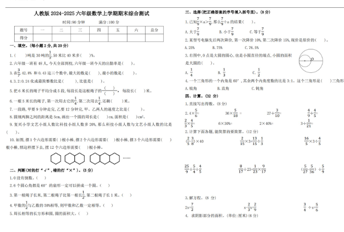 人教版2025六年级数学上册期末综合测试卷免费下载(附答案)