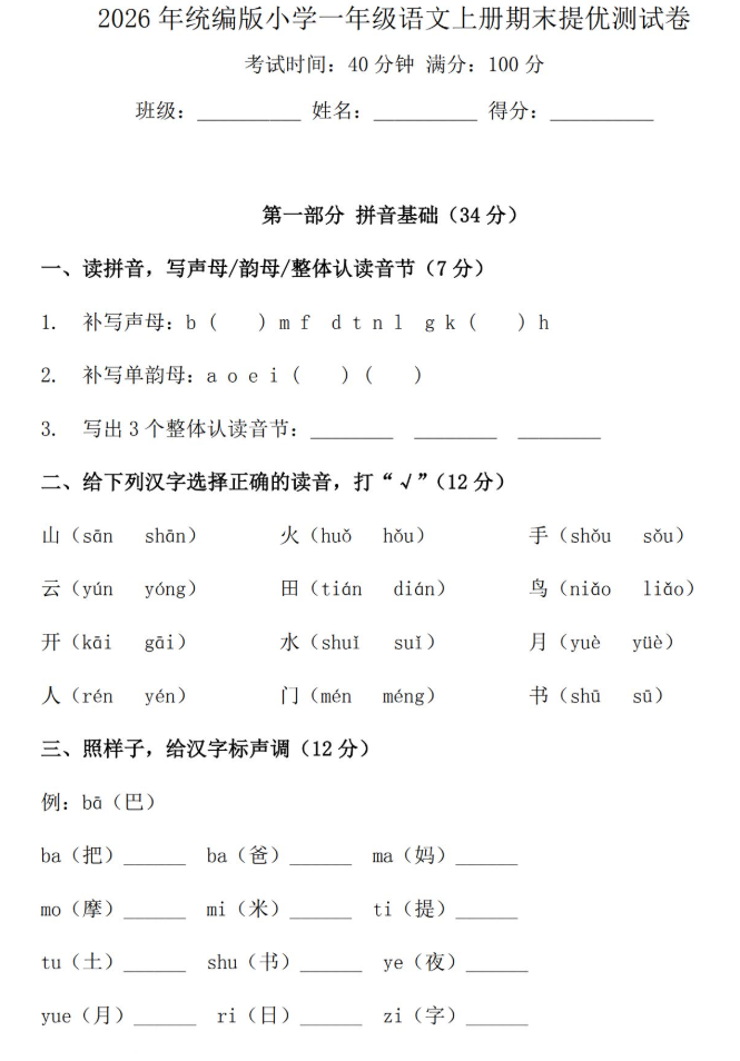 2026年统编版一年级语文上册期末提优测试卷免费下载(附答案)